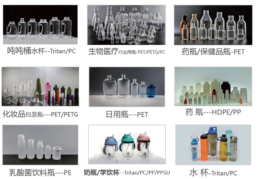 公司產(chǎn)品應(yīng)用領(lǐng)域涵蓋醫(yī)藥包裝、食品飲料包裝、化妝品包裝、運動水杯、嬰兒奶瓶、LED燈球等。制品可用原料:PET,PETG,PC,PP,PPSU,HDPE,LDPE,PS,PES,PCTG(Eastman Tritan Tx1001/Tx2001) ,SK YF300等。